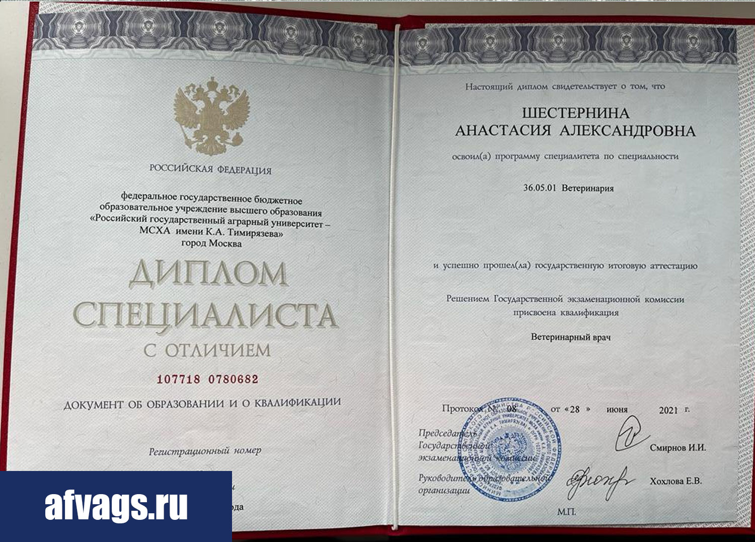 Наша компания предлагает купить диплом ветеринара изготовленный на настоящих бланках государственного образца со всеми необходимыми степенями защиты и печатями. А также, возможно занесение данных диплома в базу учебного заведения и общий образовательный реестр РФ.